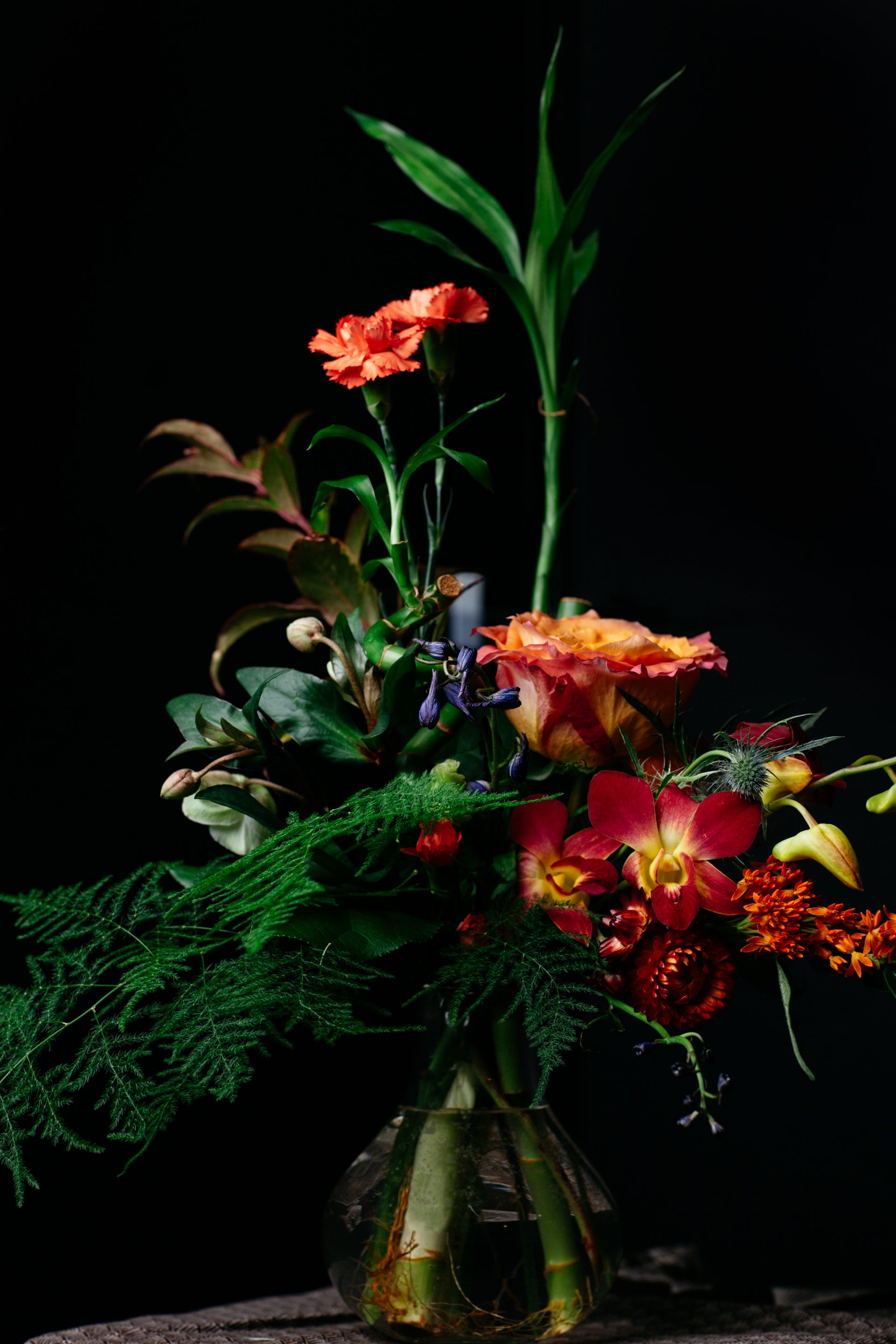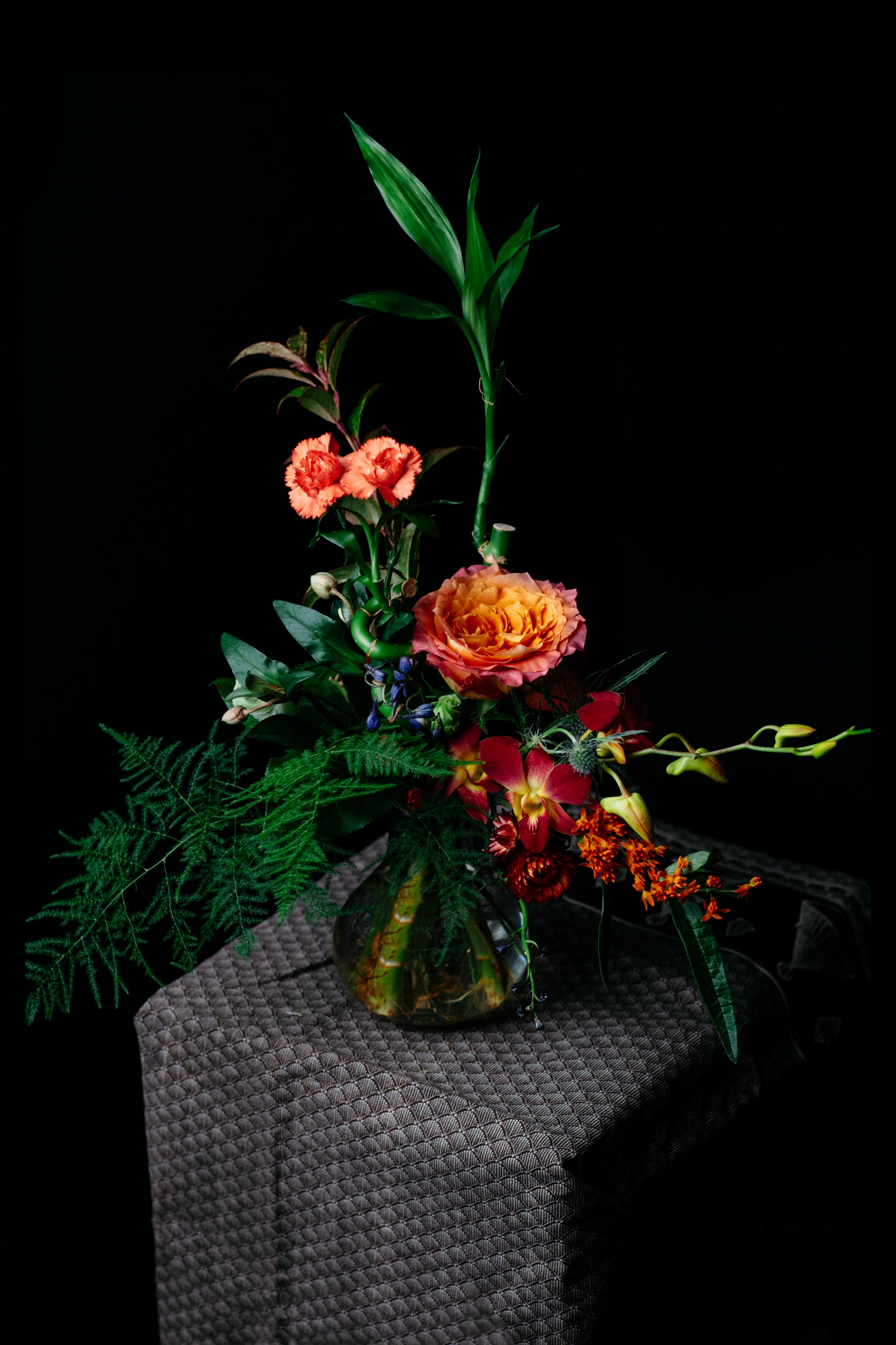 The Sutter is our petite sized modern arrangement created in a specialty found vase. By using Lucky Bamboo and pairing with complimenting blooms this design is sure to be a sculpturally engaging arrangement for any space. Once the flowers have gone through its life cycle enjoy the Lucky Bamboo in a beautiful vessel